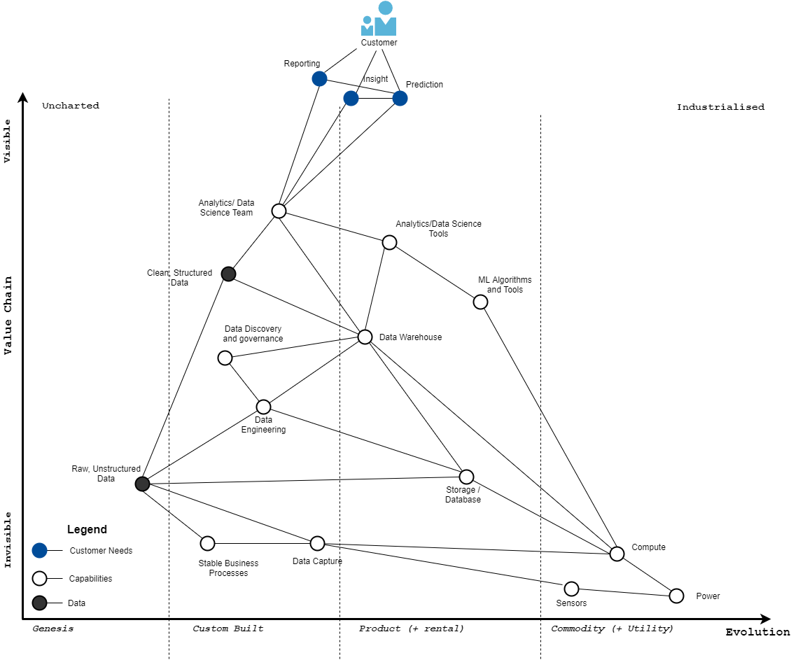 To understand this map let's start with the customer needs. The black lines indicate the needs chain. Data customers (in many cases business stakeholders) have a need for reporting, insights and predictions/forecasts.